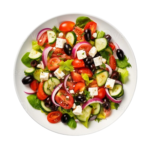 Colorful cherry tomatoes, cucumber, green pepper, feta cheese, rusk, critamo, caper, fresh oregano, olives, vinaigrette